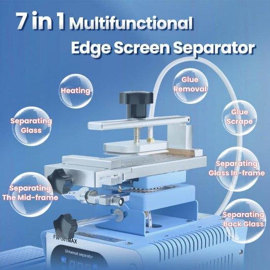 The FORWARD FW-361Max is the ultimate multifunctional tool for screen repair. This powerful 7-in-1 machine combines heating, glue removal, glass separation, and mid-frame removal for both edge and flat screens, all in one compact unit.