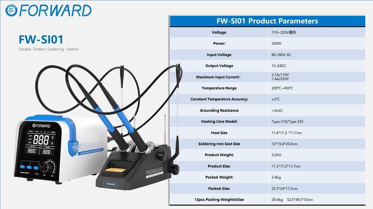 Upgrade your workbench with the FW-SI01 Double Station. This powerful 300W unit supports both 210 and 245 handles, offering high-precision temperature control, three memory channels, and a portable design for ultimate efficiency in professional electronic repairs.